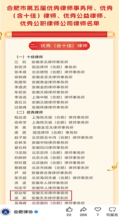 5月26日,合肥市律师协会正式公布第五届优秀律师评选结果。安徽天禾律师事务所合伙人邓业军、梁爽凭借卓越的专业表现和行业贡献,获评"合肥市优秀律师"荣誉称号。