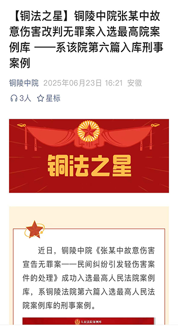 近日,由天禾律师事务所权益合伙人郭二伟律师代理的“张某中故意伤害”案件,经铜陵市中级人民法院二审开庭审理后成功改判无罪,并作为经典案例入选最高人民法院案例库。