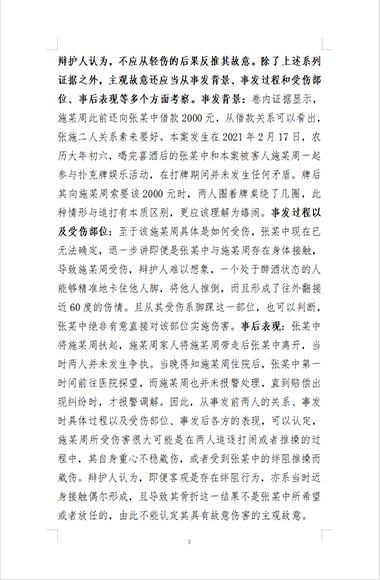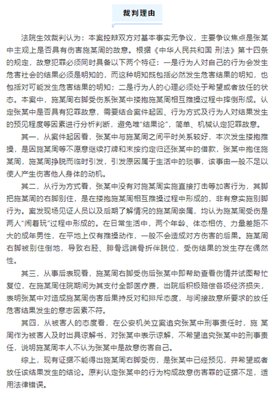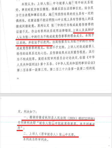 案件审理过程中,郭二伟律师积极向法院申请调阅同步录音录像,挖掘案件细节,指导当事人自行收集相关证据,并从案发前双方关系、事发具体经过、被害人受伤部位形成原因、事发后各方态度表现等多个维度进行深入剖析和考察,充分发表辩护意见,坚持张某中无伤害施某周的主观故意,不构成犯罪观点。最终,铜陵市中级人民法院采纳了郭二伟律师的辩护意见,认定张某中无罪。