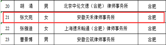 近日,安徽省律师协会正式公示《安徽省律师协会青年律师人才库拟入库人员名单》。天禾所合伙人张文苑律师凭借其卓越的专业能力和行业贡献,成功入选该省级人才库。