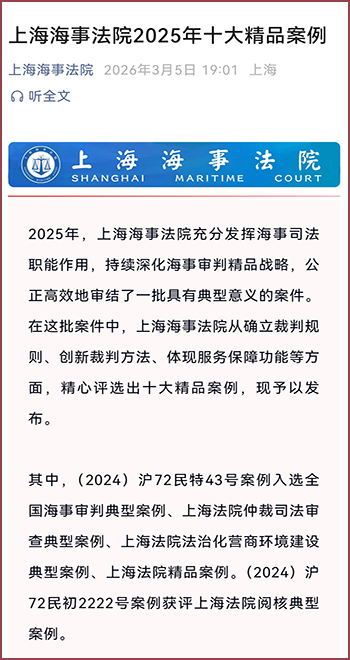 此次入选上海海事法院十大精品案例,既是对毕晨律师专业能力与法律服务态度的肯定,亦彰显了天禾所在涉外海事争议解决领域的持续深耕与实务积累。天禾律师将以此为契机,持续提升专业能力,强化涉外法律服务质量,在维护当事人合法权益的同时,助力营造市场化、法治化、国际化营商环境,为我国涉外海事司法实践发展贡献专业力量。