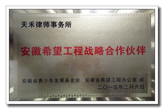 2015年2月6日,由共青团安徽省委、安徽省青少年发展基金会举办的“安徽希望工程2015迎新春爱心慈善年会”在安徽饭店召开。本所主任张晓健律师作为安徽希望工程的常年法律顾问应邀出席,并捧回“安徽希望工程战略合作伙伴”牌匾。