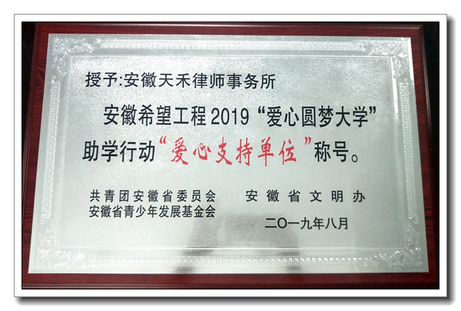 天禾所主任张晓健、党支部书记朱金宏应邀参加捐助仪式。天禾所自2013年以来连续多年组织本所律师和党员参加安徽希望工程“爱心圆梦大学”助学行动,资助优秀困难大学生,今年被共青团安徽省委、省文明办、省青基会共同授予安徽希望工程2019 “爱心圆梦大学”助学行动“爱心支持单位”光荣称号。