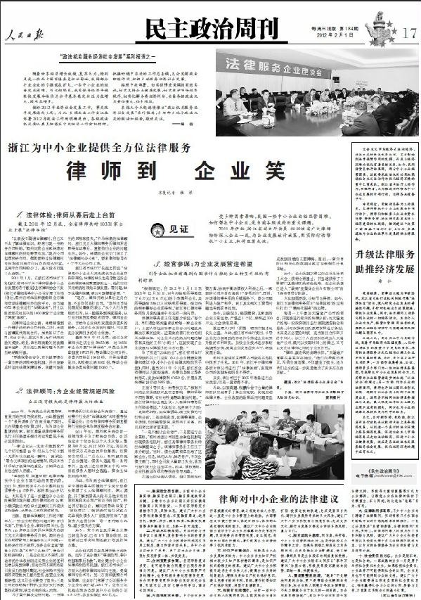 2月1日,《人民日报》以《浙江为中小企业提供全方位法律服务 律师到 企业笑》为题,用一个整版的篇幅专题报道了浙江省司法厅动员、组织律师帮扶中小企业的做法和经验,并配发了评论——《升级法律服务 助推经济发展》,指出“浙江省司法厅主动作为,积极部署,大力推进律师帮扶中小企业发展的专项行为,值得各地借鉴学习”。现将全文刊登如下: